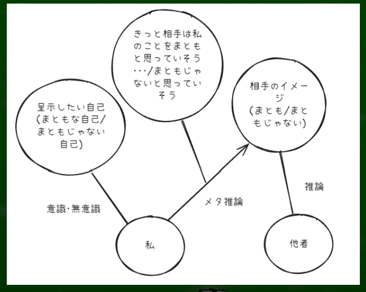 このように、他者が自分を見ている推論過程に対する推論を「メタ推論」という。メタとは一般に「上位」を意味する。たとえば「自分の考え方や学び方について考えること」をメタ認知という。