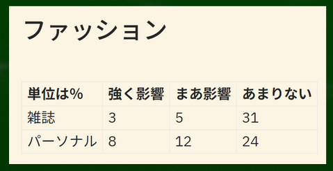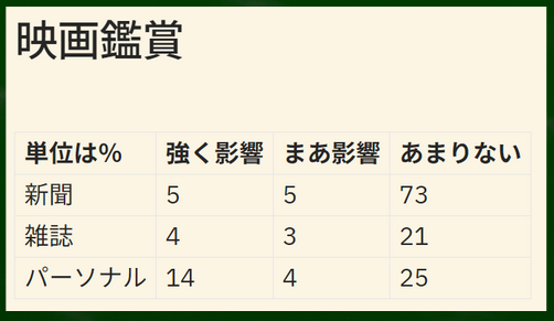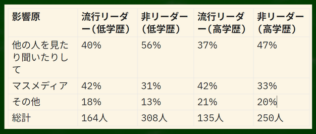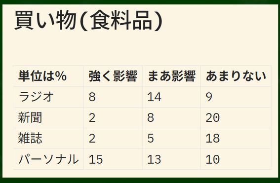 マスメディアや対人関係の影響の割合を表にしたものがこちらである。