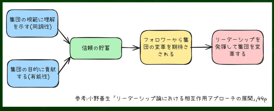 特異性-信頼理論(英:Idiosyncrasy-Credit Theory):リーダーとなる人間はまず規範に従い信頼を積む → 能力を示して信頼を強化 → 変革行動でリーダーシップを発揮するという段階的・相互作用的プロセスでリーダーシップが成立すると考える理論のこと。