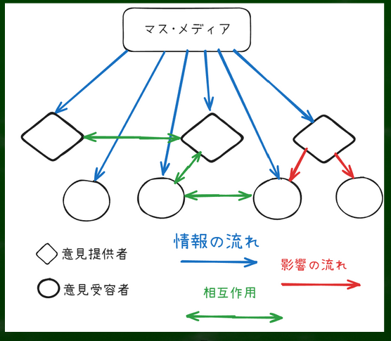 ラザースフェルド、ベレルソン、ヘーゼルの『ピープルズチョイス』(1944)やカッツ、ラザースフェルドの『パーソナル・インフルエンス』などで提唱された概念。