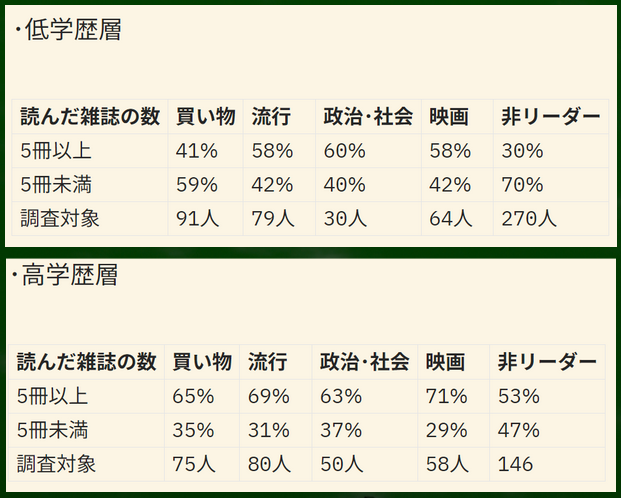 オピニオンリーダーと非リーダーの比較の表がこちら。学歴や雑誌の購読数などで分類されている。