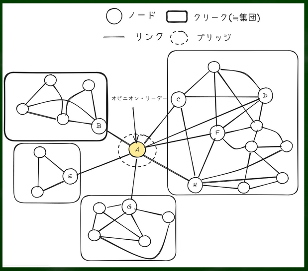 ブリッジに位置する、集団の内側と外側をつなぐ橋渡し的役割を果たすような人がオピニオンリーダーとなる。