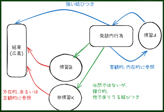 つまり、発語内行為によって聞き手に慣習的に生じるような「結果」と、聞き手によるその「結果」を通じた慣習的、あるいは非慣習的に生じるような「結果」を区別することが難しいというわけだ。