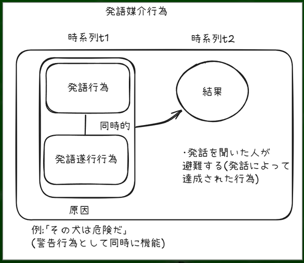 たとえば「その犬は危険だ」という発話は発語行為であり、かつ警告行為であるという意味で発語内行為である。そして、その結果、聞き手が避難したという結果をもたらした場合、発語媒介行為だといえる。