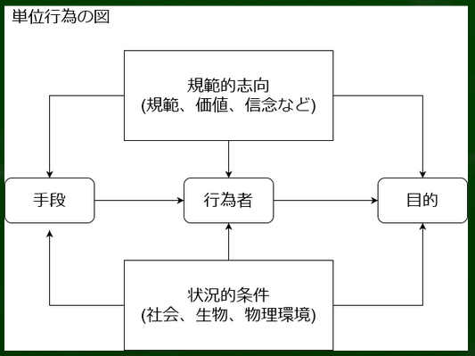 主意主義的行為理論行為を分析の基礎単位として考え、行為を規定する要素を遺伝や環境といった条件だけではなく規範をも考慮し、さらにその規範を科学的・合理的なものだけではなく宗教といったような没合理的なもの(非合理的なものとは区別される)を含めることにより、行為者を規範へ意志をもって努力する存在として主意主義的に構成された行為理論のこと。