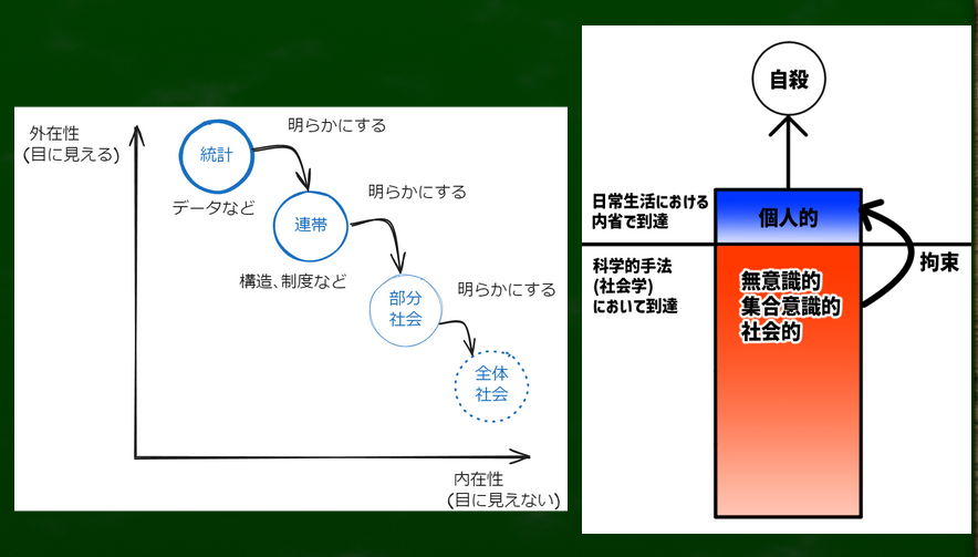 デュルケムの場合はこのようなイメージとなる。社会における構造が可視化されたものが法であったり統計であったりするわけである。