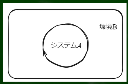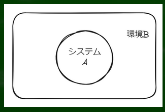 このあたりをスッと理解することは難しい。たとえば円の中がシステムであり、円の外が環境であるとする。この場合、システムと環境は線という境界によって区別されている。