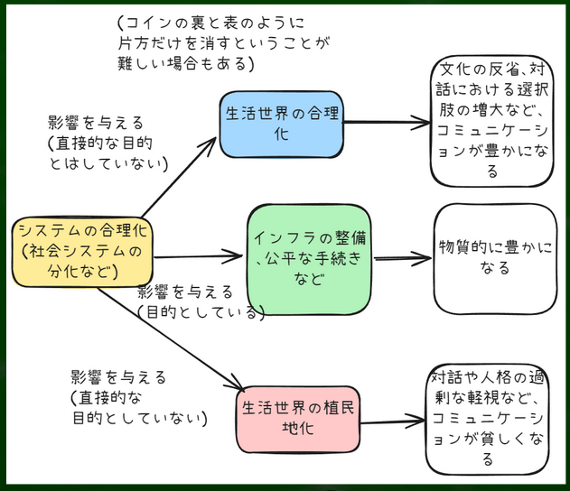 さらに、システムの合理化は生活世界の合理化だけではなく、対話をする土台としてインフラの整備、市場の機能、行政の安定といったものももたらしているという意味で、生活世界にポジティブに寄与している。