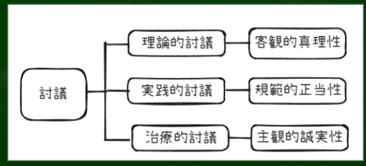 真理性が問題となるときは理論的討議、正当性が問題となるときは実践的討議、誠実性が問題となるときは治療的討議である。